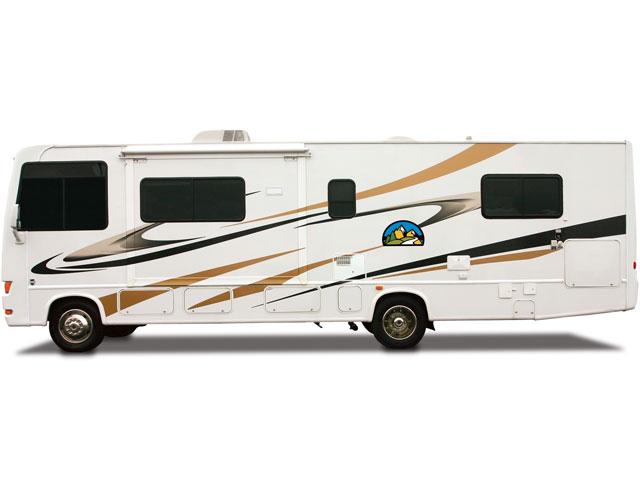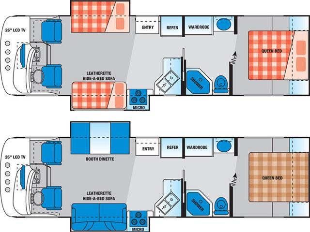 Powered by a V8 / V10 engine and automatic transmission with cruise control. AM/FM Radio with CD player, TV/DVD. 3 burner stove and a microwave oven, sink , two way Fridge with Freezer, Furnace, Water Heater, a Toilet and Shower, and 4kw Power Generator. Permanent Queen size bed (153 x 190cm) at the back, the slide-out dinette (94 x 173cm) and sofa (137 x 183cm) can be converted into two double beds.