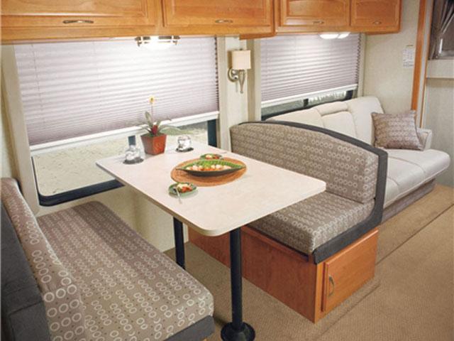 Ideal for four adults and 2 children. The single slide-out design guarantees a more spacious living area and a large exterior storage bay. In-dash and Factory roof-mounted air conditioning system provide generous cooling both in the driver’s cabin and in the living area. AM/FM Radio – Cassette or CD, range (stove), microwave, refrigerator, sink, wash basin, shower, toilet, water heater, heater & thermostat. A power generator is located in the external side compartment. The vehicle has a much compact bed configuration to have a more spacious space in the living area. Cab-over Bed that can accommodate 2 persons, Dinette and couch can be converted into two single beds, and a permanent Bed located at the back of the vehicle.