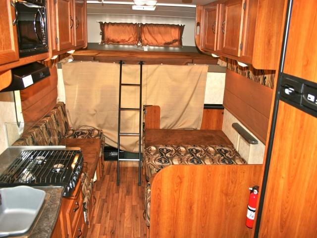 Extremely maneuverable, sleeping up to 5 with a rear queen bed and a dinette bed along with an over the cab bed for the kids. Road Bear RV brings you this RV with all the conveniences you'll need for the short get-away or extended trip, with a large storage bin underneath - 4 sets of clubs. A toilet, sink and shower, hot water heater, stove, microwave, fridge & freezer, the only question is how much fun are you going to have? The powerful Chevrolet V8 or Ford V10 gasoline engines are more economical than in the larger RV's and will move you along effortlessly while the air conditioning keeps you cool. Enjoy the outdoors and sit protected under the retractable awning!
